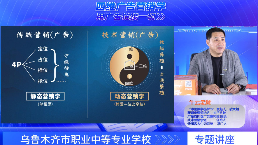 直播中,牛云老师深入浅出的讲解,揭开了技术营销学的神秘面纱,借助四维广告营销学的创新理论,为观众打开认知边界,引领中国的本土营销学,走向世界!