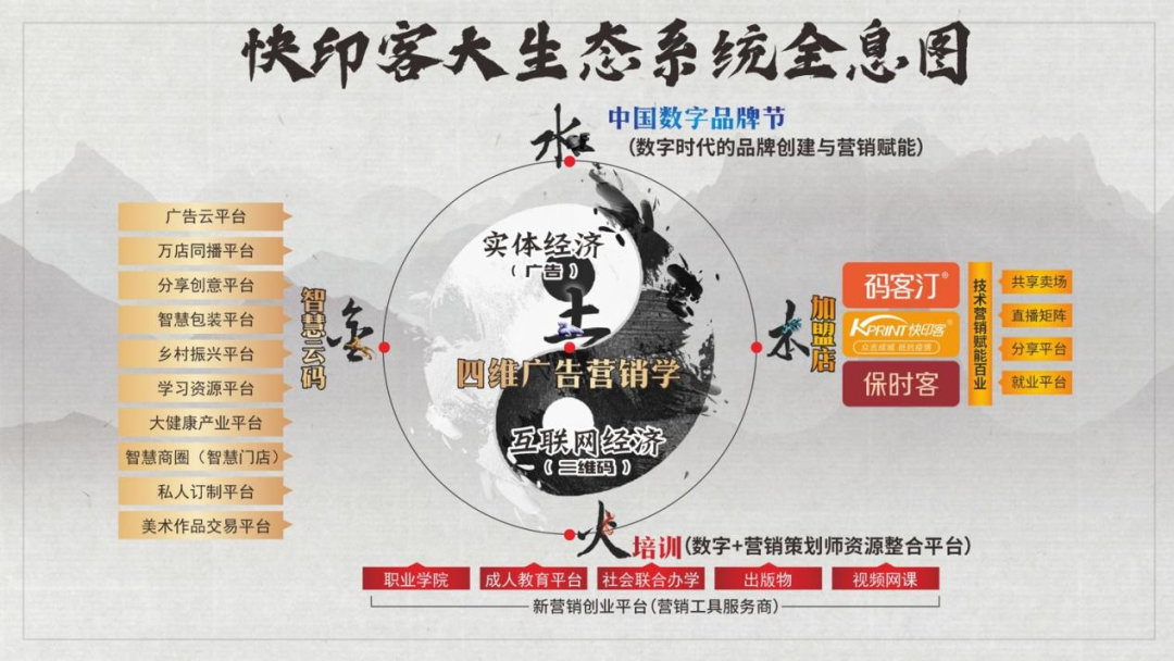 面对国内企业日益增长的技术营销需求,快印客大生态系统应用而生。快印客大生态系统以四维广告营销学为理论依据,通过互联网技术实现广告的赋能升级,进而帮助企业突破经营维度,通过颠覆性创新实现业绩倍增。